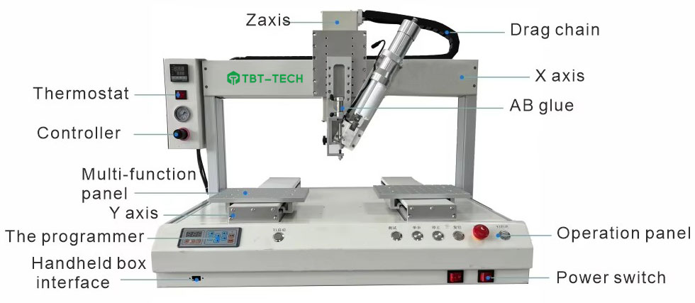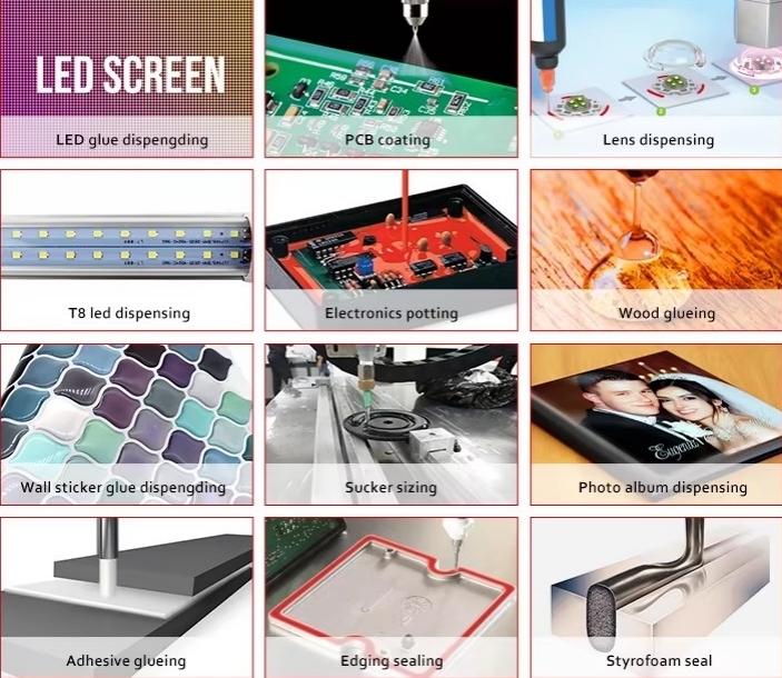 3. Semiconductor encapsulation, PCB part fixation and protection, LCD glass machine encapsulation and adhesion, mobile phone board, speaker assembly line, battery box, auto parts gelatinization, hardware component seal, quantitative liquid filling, chip binding, etc.