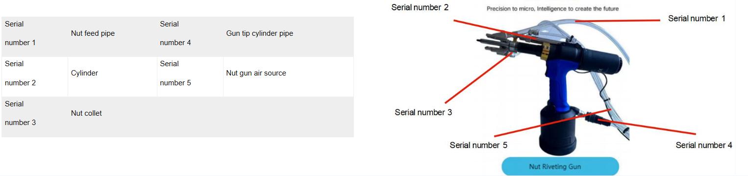 1. Initial Startup: After starting the machine, pull the nut gun trigger to automatically feed a nut into the gun for riveting.2. Operation Cycle: After completing riveting, move the gun head approximately 100mm away from the product surface before releasing the trigger to initiate the next nut feeding cycle.