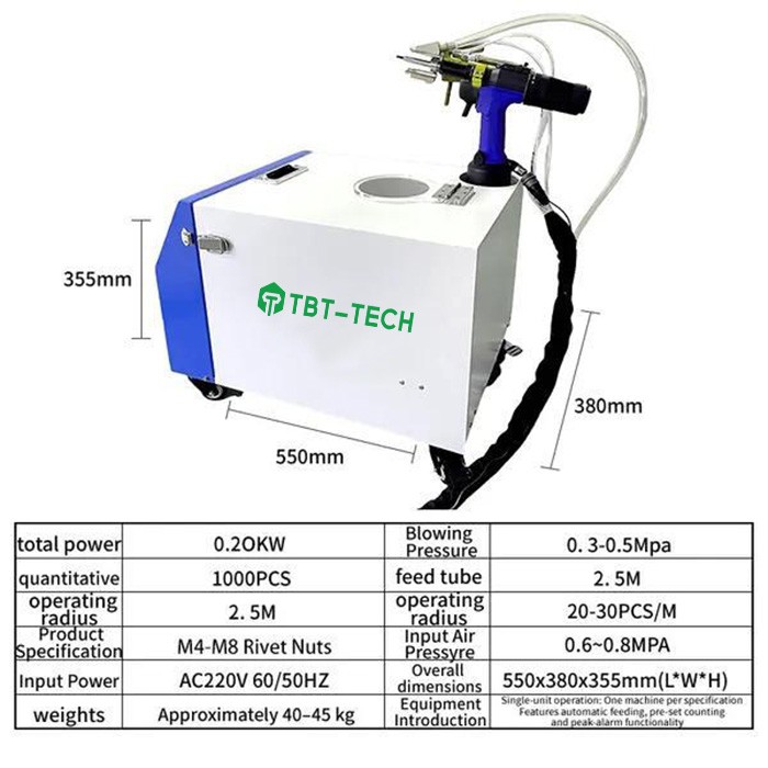AU500 is a high-performance riveting system that integrates advanced blind riveting tool functionality with an automatic rivet nut feeding mechanism This tool system supports a wide range of rivet nuts from M4 to M10, featuring full automation and high reliability It is well-suited for industrial large-scale production scenarios, capable of achieving an installation efficiency of 20-30 rivet nuts per minute in most applications