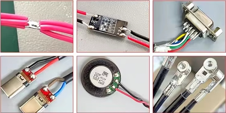 This small semi - automatic soldering machine is widely used in the wire harness welding field, such as data cables USB, micro USB, mini USB, charging heads of iPhones, Type - C, HDMI plug docking, motor wires, etc., wire harness soldering.